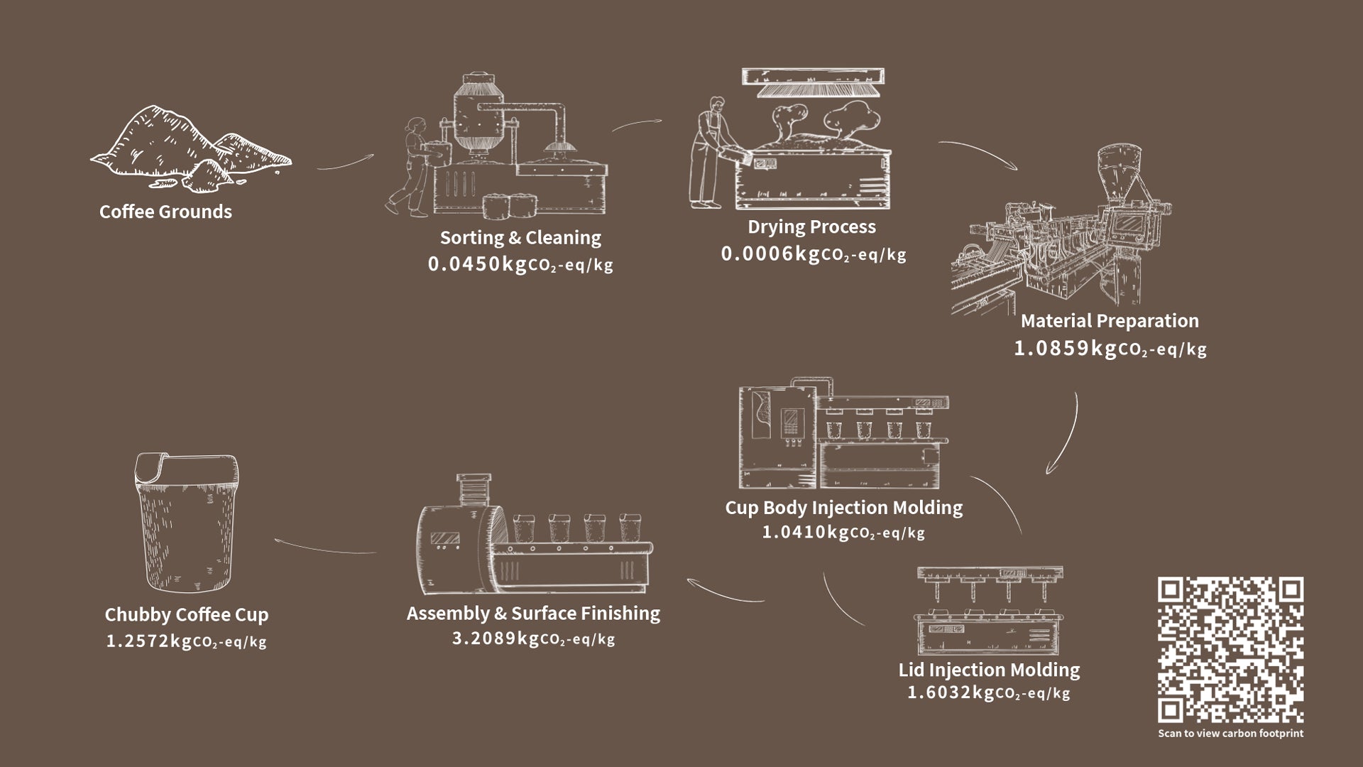 The cup is made of an innovative bio-based material containing 35% coffee grounds. It features a double-layer structure, with a 316L stainless steel inner liner and an outer layer wrapped in renewable coffee grounds material, which is recycled from approximately 5.12 cups of coffee grounds. Its sturdy and cute design ensures a comfortable grip and stability. With a carbon footprint of only1.2572kgCO2-eq/kg, it offers a more eco-friendly alternative compared to traditional plastic, ceramic or glass cups. The screw cap is easy to open with one hand, preventing spills and dust. It is suitable for both office and travel use, and every use is a promotion of sustainable living.